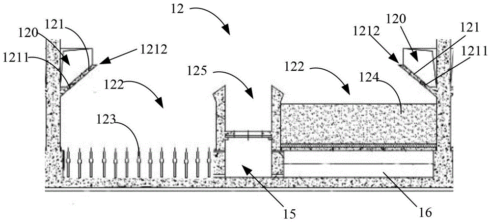 參見圖1和圖2,v型濾池包括進水總渠和多個濾池本體12,每個濾池本體12包括v型槽121、濾池部122、排水渠125、長柄濾頭123和均質濾料124等,排水渠125的端壁上開設有排污口1251。v型濾池的過濾工作原理是:由進水總渠流入經進水閥13流進來的待濾水,漫過堰口14經兩邊側孔120進入兩側v型槽121,從v型槽121槽底的配水孔1211和v型槽121的槽堰1212同時進入濾池部122內部,再由均質濾料濾層124過濾后變為清水,清水從濾頭123流向底部空間16,又從方孔18匯聚氣水分配管渠15,最后經管廊水封井、出水堰、清水管19流向清水池。