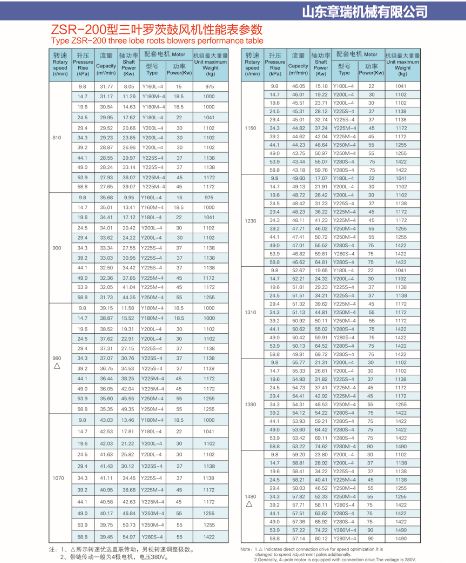 其流量從0.52m3/min-180m3/min,升壓9.8Kpa-98Kpa,共二十種機型,2500多種參數規格,且有體積小,流量大,噪音低,運行平穩可靠等特點,相應的主流型號有:ZSR50羅茨鼓風機、ZSR65羅茨鼓風機、ZSR80羅茨鼓風機、ZSR100羅茨鼓風機、ZSR125羅茨鼓風機、ZSR150羅茨鼓風機、ZSR175羅茨鼓風機、ZSR200羅茨鼓風機 、ZSR250羅茨鼓風機、ZSR300羅茨鼓風機、ZSR350羅茨鼓風機等。對應的電機功率從0.75kw-355kw。具體羅茨風機200型號參數表如下: